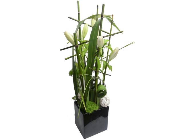 A striking design of bamboo or sticks, flax, bear grass, white lilies or anthuriums, moss, and textured balls arranged in a black ceramic container. Perfect for a minimalist décor.