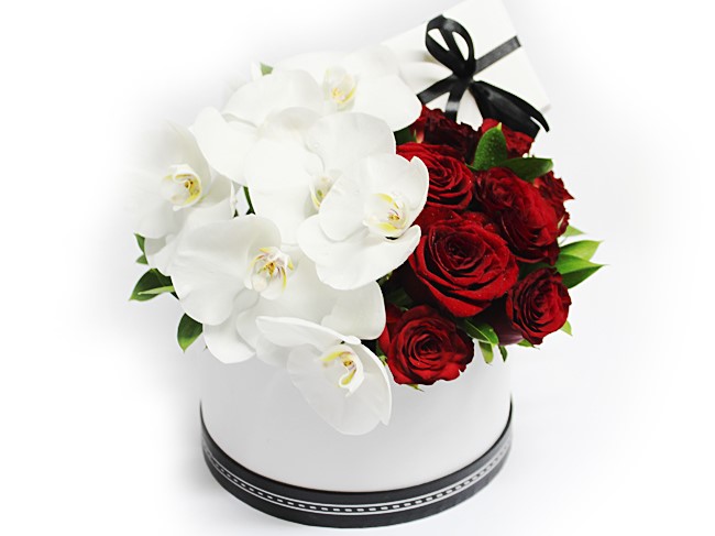 OMG ... this is sooo styley it takes your breath away. A hat box filled with red roses and dripping in orchids, with a small box of chocolates tucked in the back. Pure class!