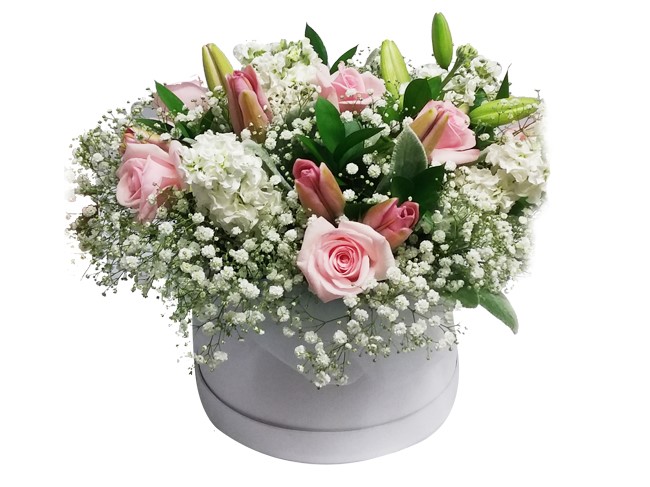 A magical vision of pink or pastels set within wafts of gypsophila and staged in a very nice little box ... such a sweetie.