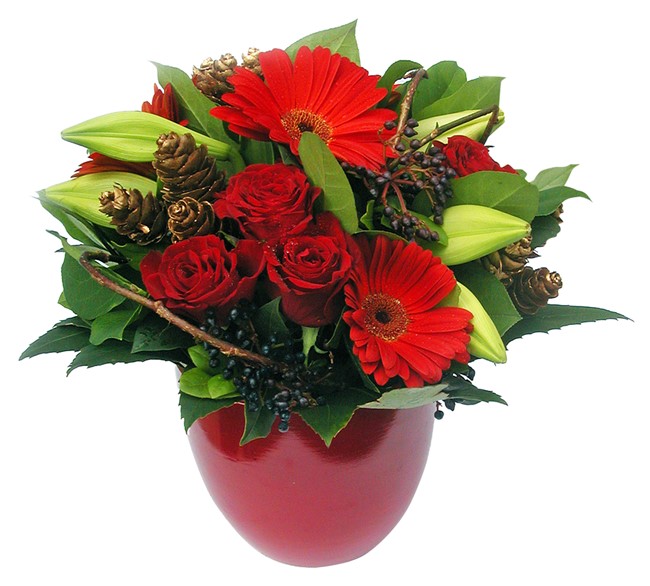 Its got lilies, cones, pine, red flowers, and sits in a festive container (either silver, gold or red) It must be Christmas!