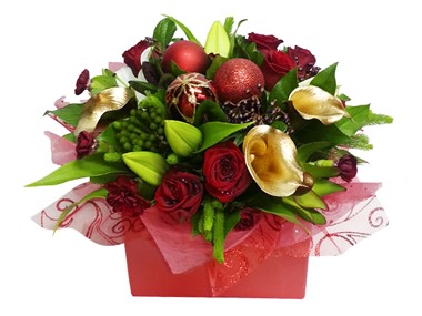 Bold and bright in reds and greens including bling baubles this design has Christmas written all over it. Arranged in a box ,it requires little maintenance and is long lasting. Sorted.